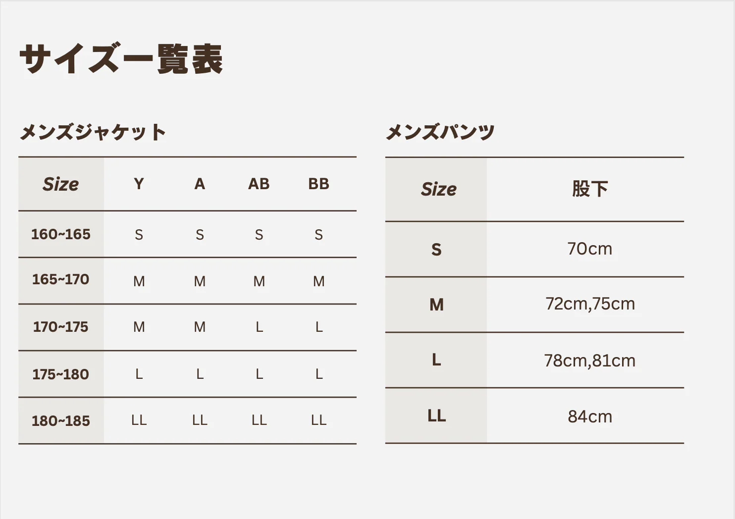 | がっちり (AB体) | 81~84~87 cm | 83~86~89 cm | 85~88~91 cm | 87~90~93 cm | 89~92~95 cm |